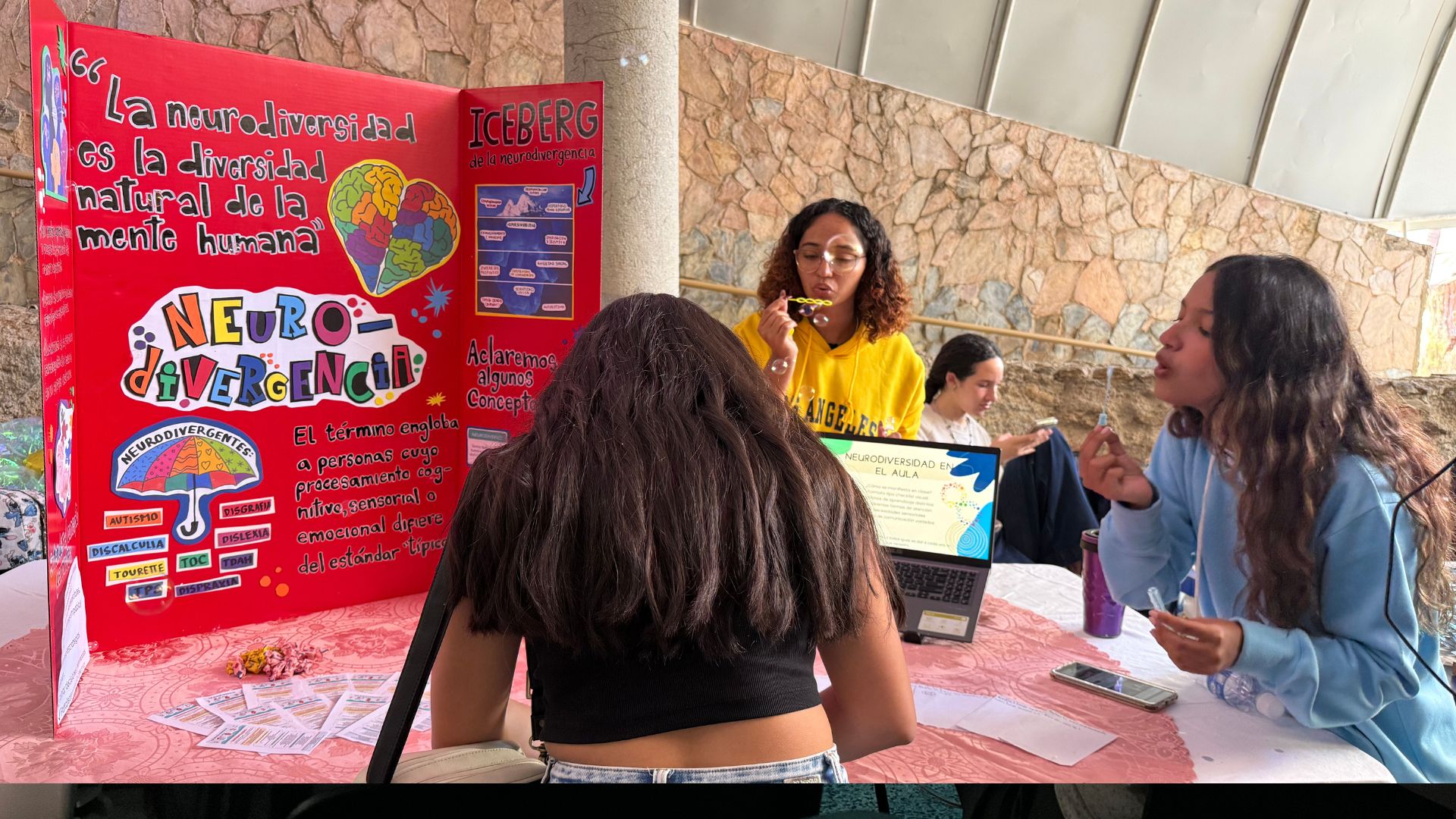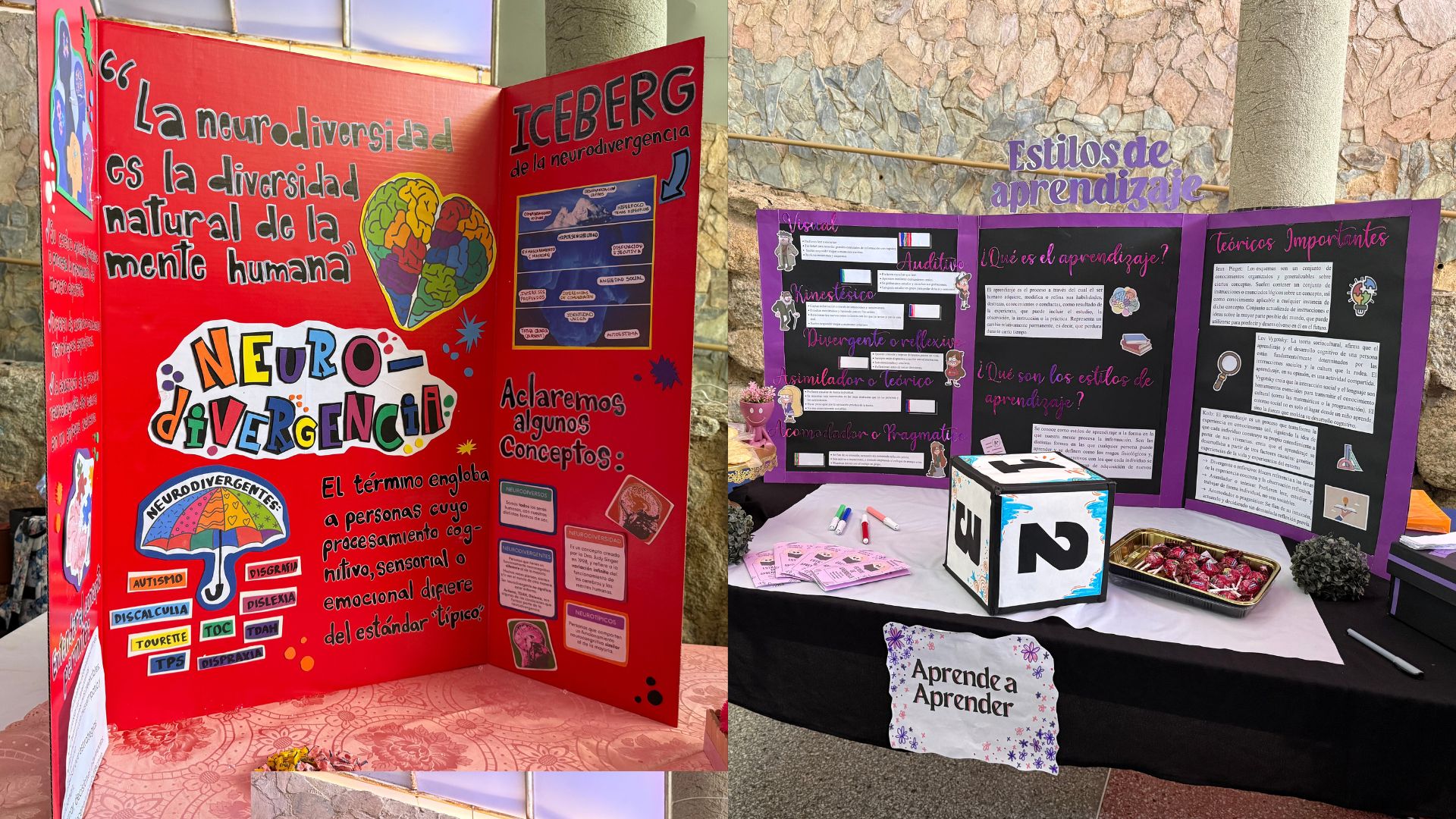Los stands también abordaron las habilidades socioemocionales, fundamentales para el desarrollo personal y social, y el acoso en sus diversas formas, así como sus consecuencias, promoviendo la conciencia y prevención dentro del entorno universitario. Además, se presentó la inteligencia emocional y la teoría de las inteligencias múltiples, explicando sus tipos y cómo influyen en la vida cotidiana y el aprendizaje. Un tema de gran relevancia tratado fue la neurodiversidad, que resaltó la diversidad natural de la mente humana y la importancia de reconocer y valorar estas diferencias como parte esencial de la convivencia y el desarrollo social.