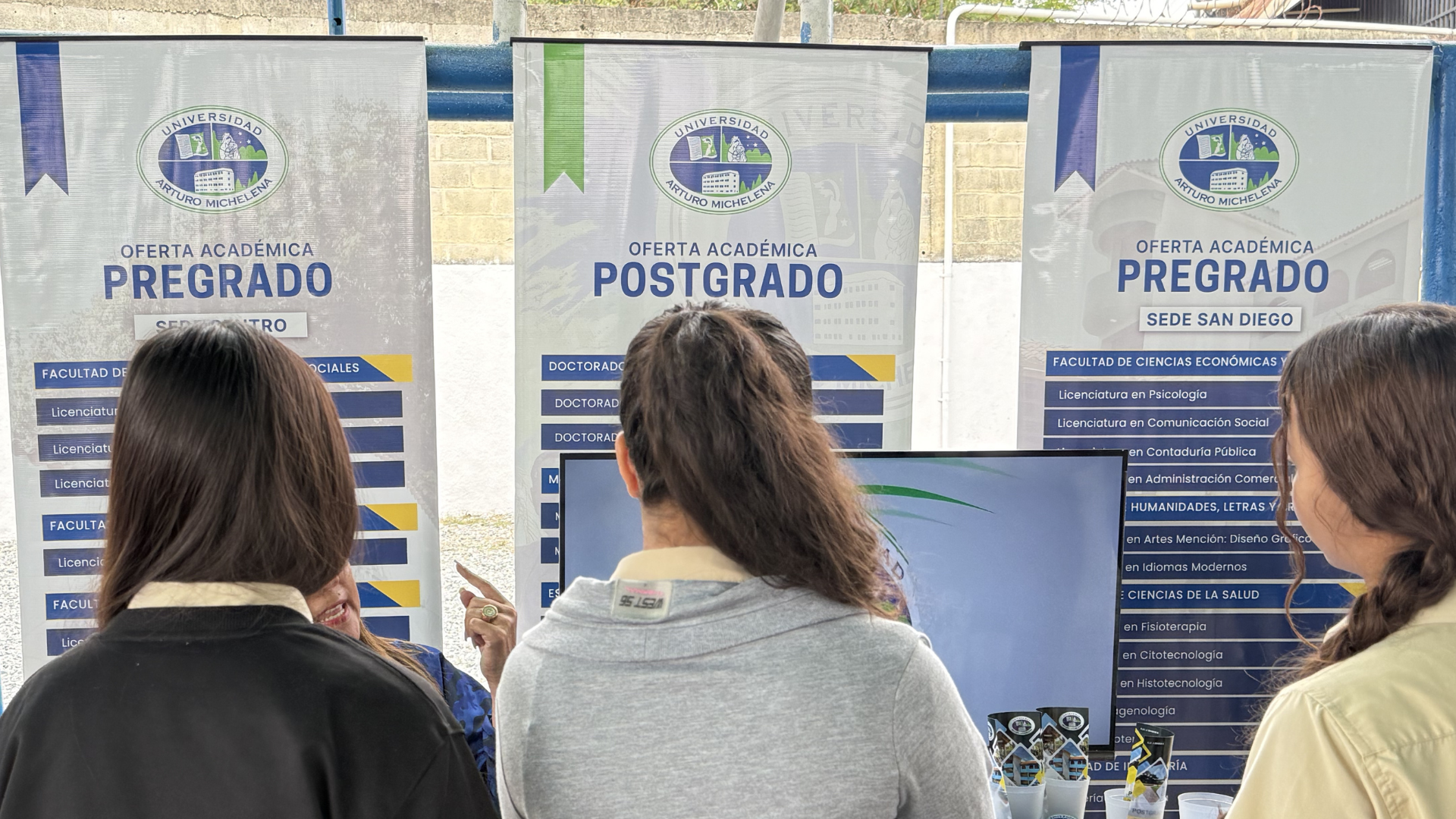 San Diego, 16 de abril. – Con el propósito claro de ofrecer a los estudiantes de educación media herramientas que les permitan tomar decisiones informadas sobre su futuro académico y profesional, la Universidad Arturo Michelena (UAM) participó en la Expovocacional realizada en el Colegio Santa Sofía, el día miércoles 15 de abril. La jornada contó con la participación de distintas instituciones educativas como: el Colegio Piedra de la Virgen, Colegio Louis Pasteur y el Colegio San Miguel Febres Cordero.
